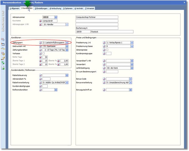 In der Karteikarte "Konditionen" der entsprechenden Personenkonten muss außerdem die Zahlungsart "Lastschrift" eingetragen sein.