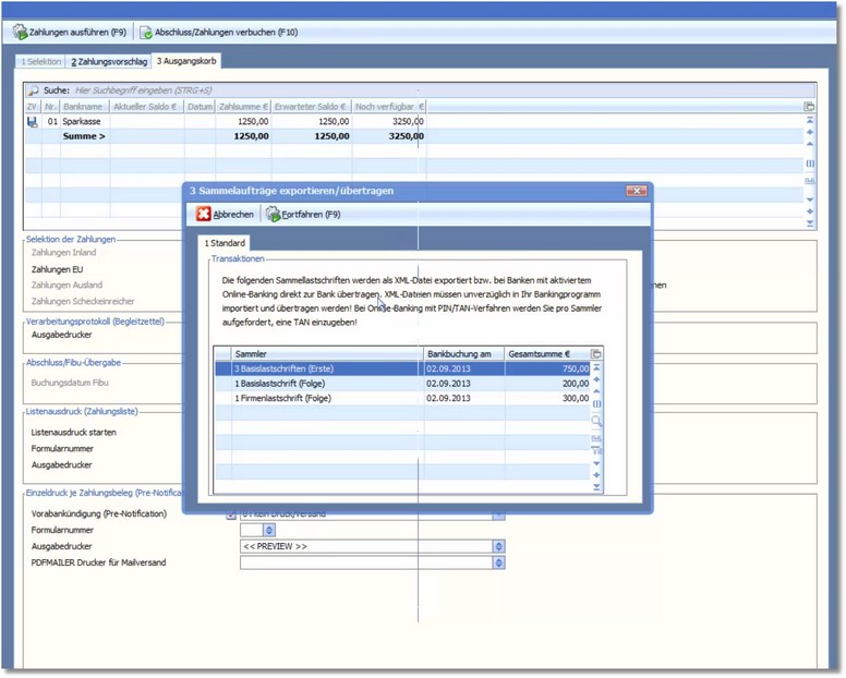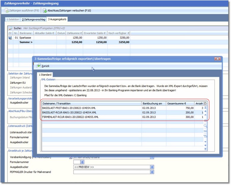 Sie erhalten anschließend eine Übersicht über die einzelnen Dateien mit jeweils der Summe der enthaltenen Lastschriften.
