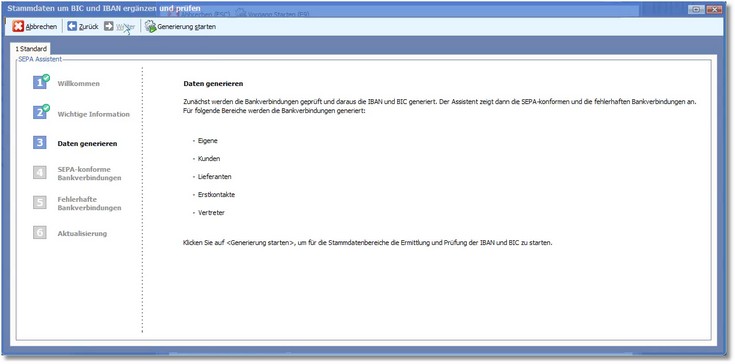 3. Im nächsten Schritt werden die Bankdaten geprüft und IBAN und BIC generiert. Starten Sie die Generierung über den Button <Generierung starten>.