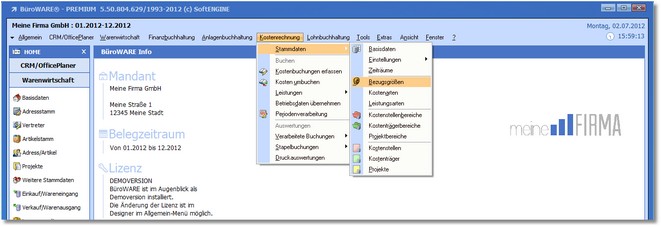 1. Klicken Sie mit der Maus im Hauptmenü auf "Kostenrechnung > Stammdaten > Bezugsgrößen".