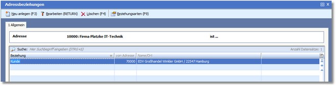 Die in Bearbeitung befindliche Adresse, welcher eine Beziehung zugeordnet werden soll, ist in dieses Feld bereits eingetragen.