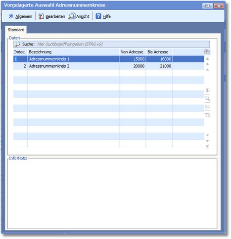 Die vorgelagerte Auswahltabelle der Adressnummernkreise wird geöffnet.