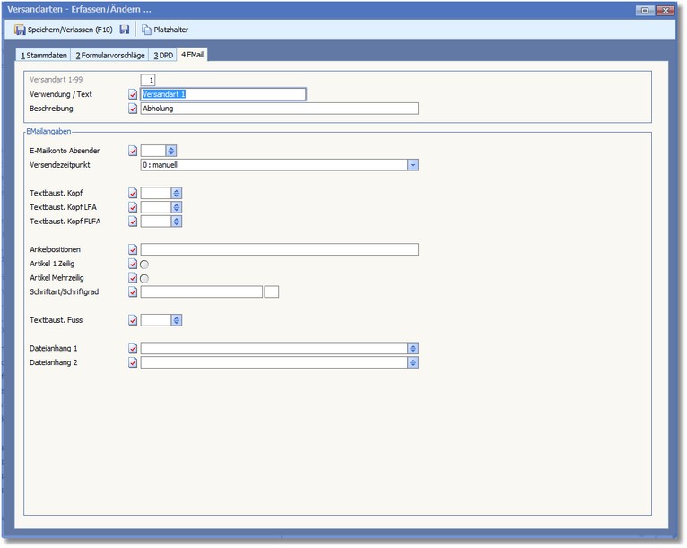 << Hier KLicken um eine Inhaltsübersicht anzuzeigen >> Navigation: Warenwirtschaft > Stammdaten > Basisdaten > Versandart > Die Karteikarte "eMail" |