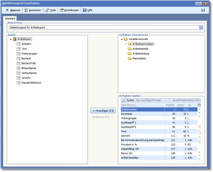 Navigation:  Warenwirtschaft > Stammdaten > Artikelstamm > Selektionspool Artikelstammdaten >