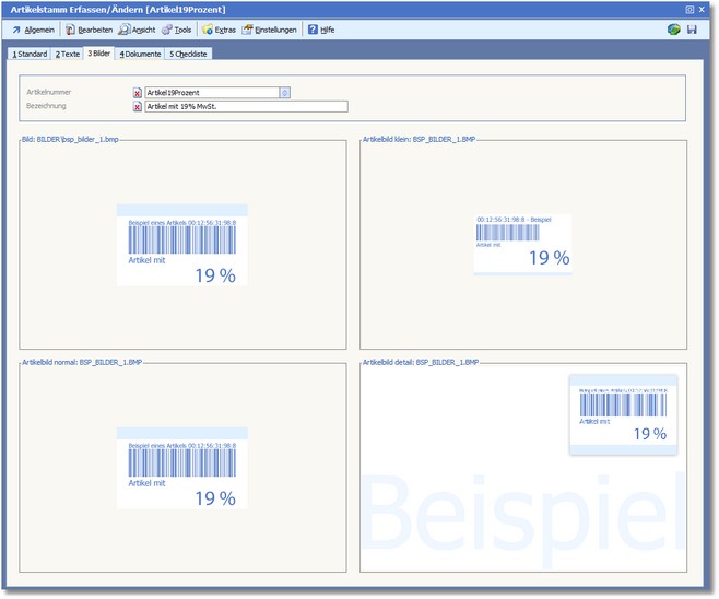 Sie haben die Möglichkeit, einem Artikel Bilder zuzuordnen, welche in Tabellen und Belegen angezeigt werden. Bilder können auch zur Anzeige in Shops genutzt werden.