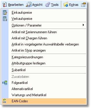 1. Klicken Sie in der Artikelbearbeitung mit der Maus auf den Menüpunkt "Bearbeiten > EAN-Codes".