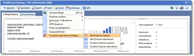 Alle Positionen eines oder mehrerer Belege in den aktuellen Beleg kopieren: