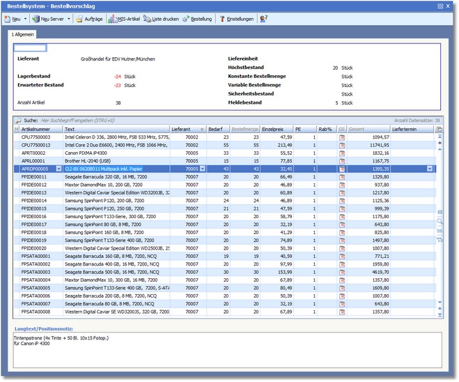 - die Bestellmenge beim Lieferanten (Karteikarte "Bestellvorschlag"),